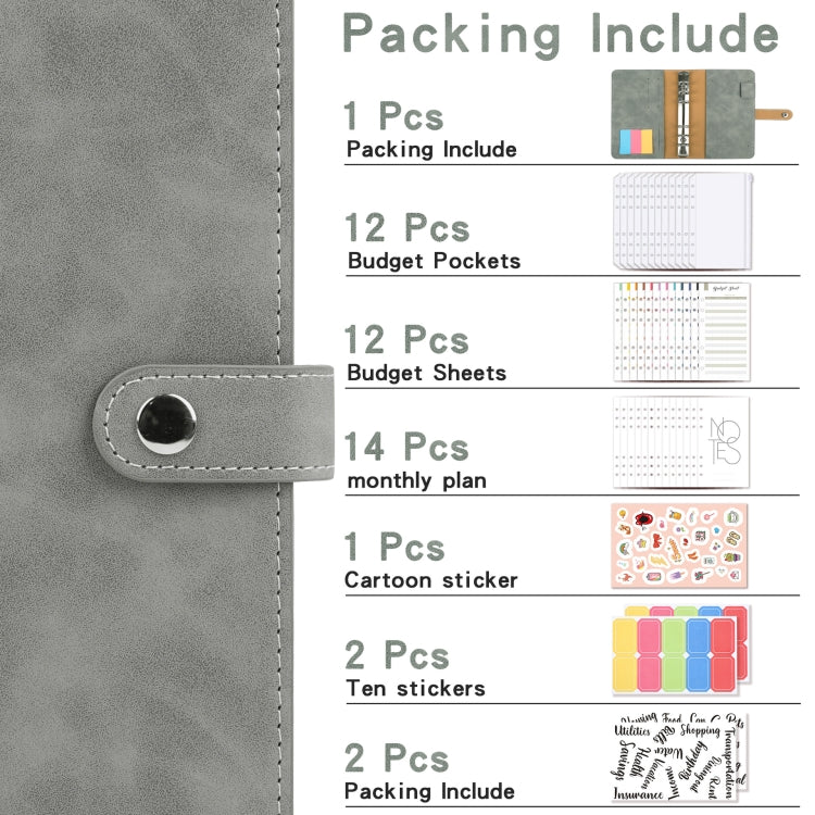 8. Included accessories: zipper pocket x 12 + budget table x 12 + monthly plan x 14 + cartoon sticker x 1 + index sticker x 2 + English sticker x 2